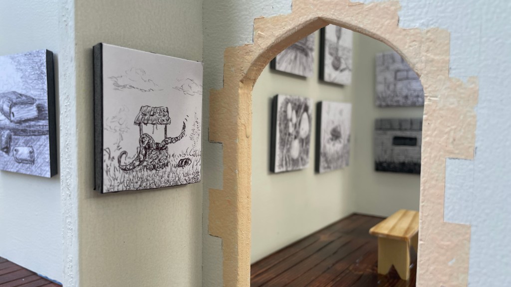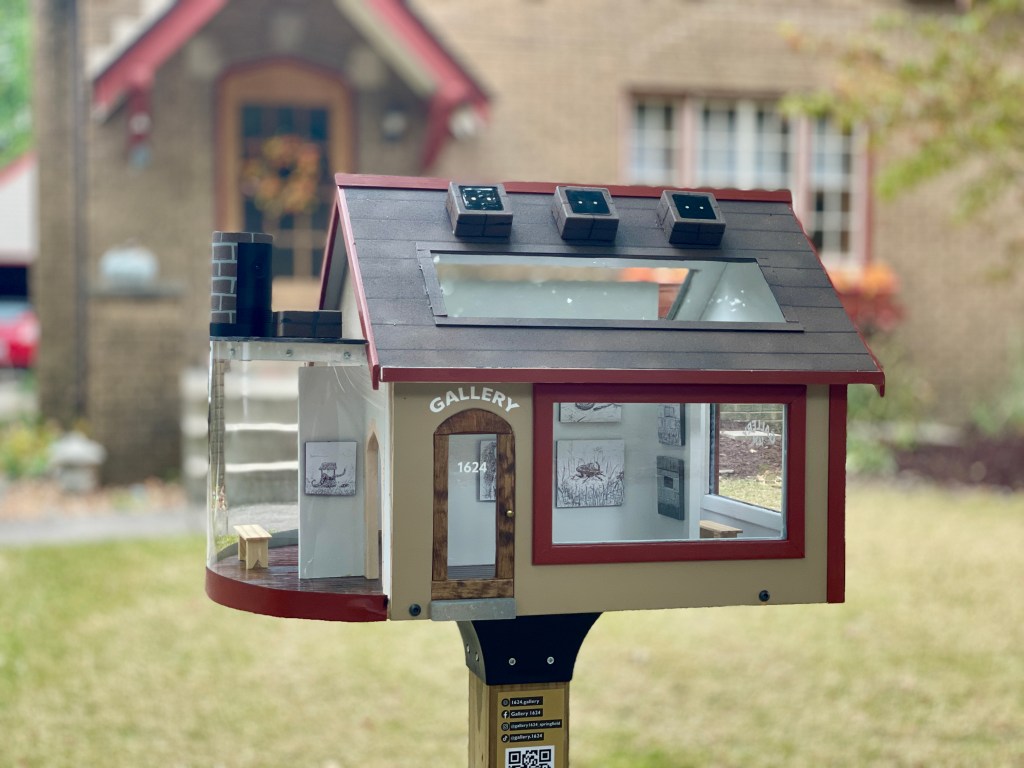 The purpose of Gallery 1624 is to showcase diminutive original art by professional, amateur, and student artists. This miniature gallery is located along a sidewalk in Springfield, Illinois for public viewing.
