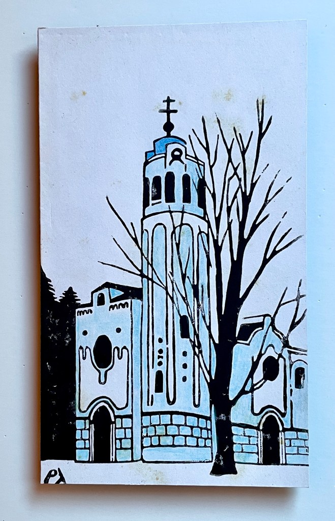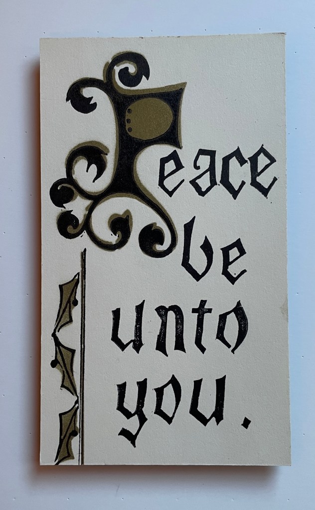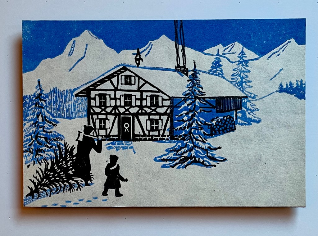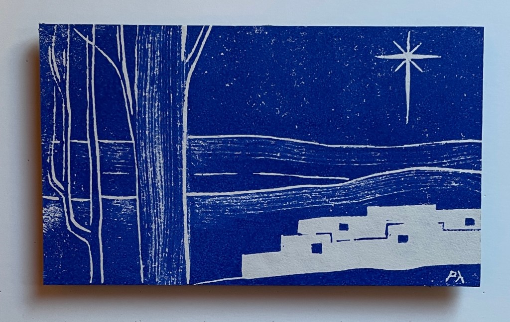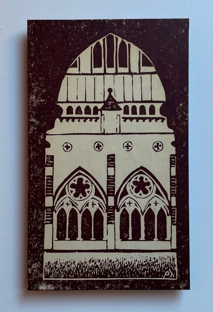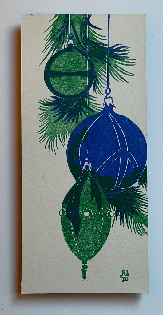 This exhibition features 13 block prints by Richard Leary. These prints were hand carved and most were printed as Christmas cards during the years 1968 – 1999. Leary and his wife are world travelers so many of the carvings are based on places they visited during their travels. Note that he signs many of his works ρλ (rho lambda) the Greek versions of his initials. Richard Leary is the father of the gallery owner.