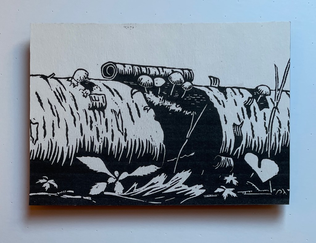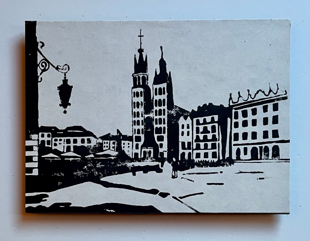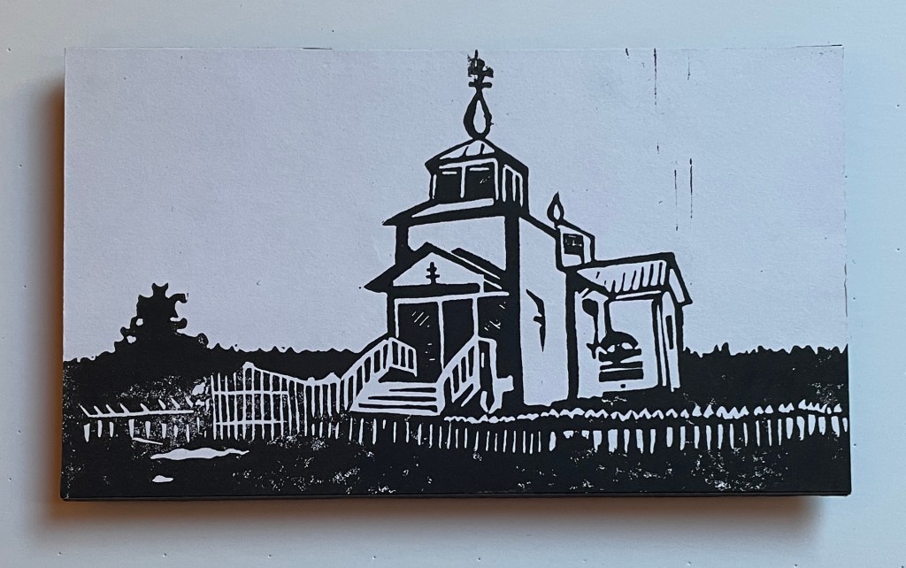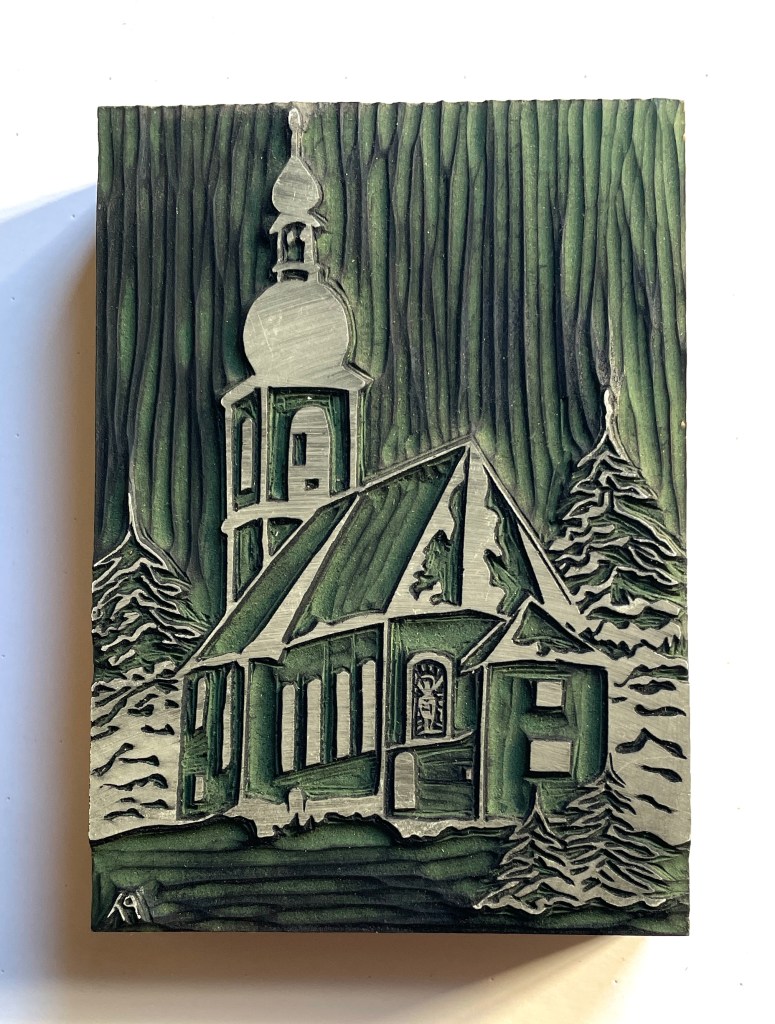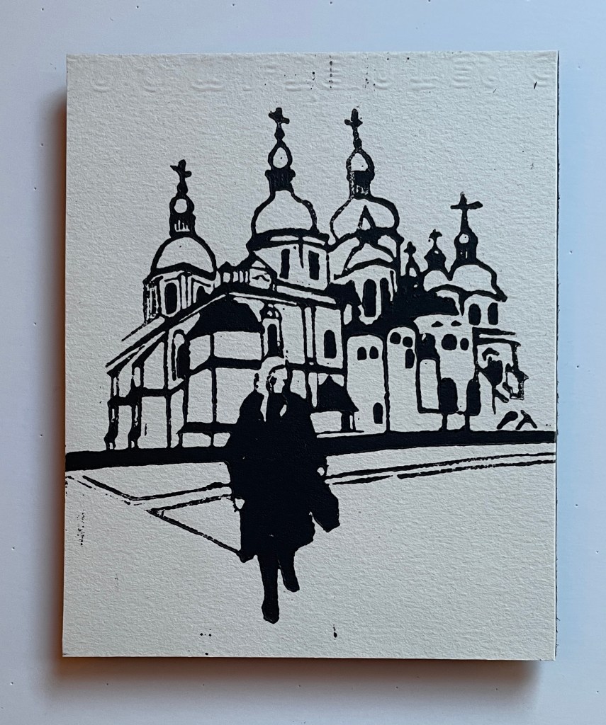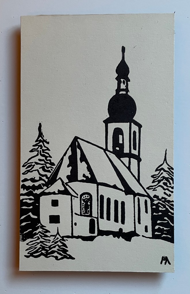 This exhibition features 13 block prints by Richard Leary. These prints were hand carved and most were printed as Christmas cards during the years 1968 – 1999. Leary and his wife are world travelers so many of the carvings are based on places they visited during their travels. Note that he signs many of his works ρλ (rho lambda) the Greek versions of his initials. Richard Leary is the father of the gallery owner.